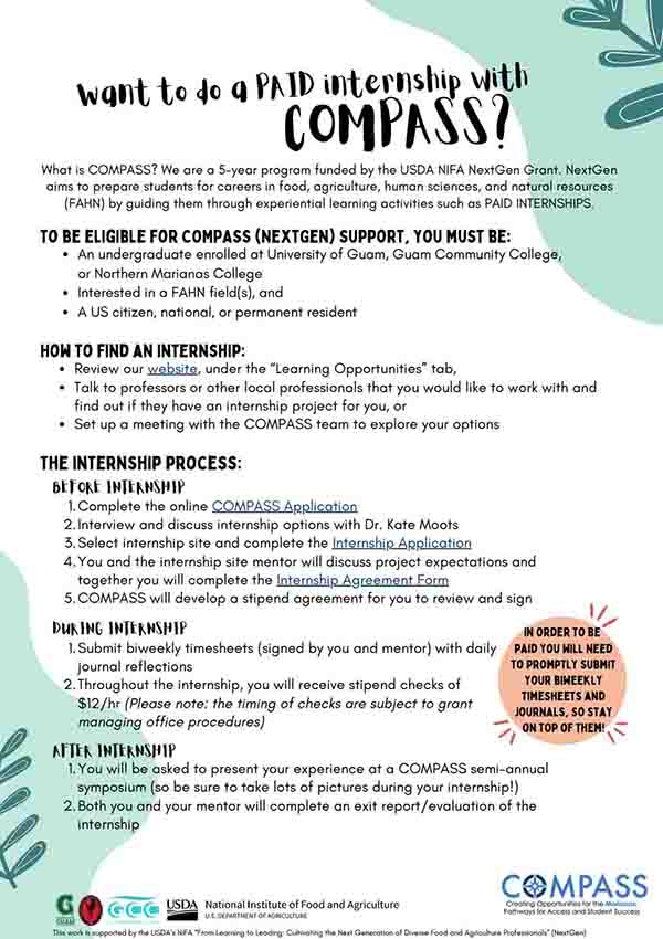 Please see the info sheet and COMPASS Internship Guide on the right for all the details of how to apply!